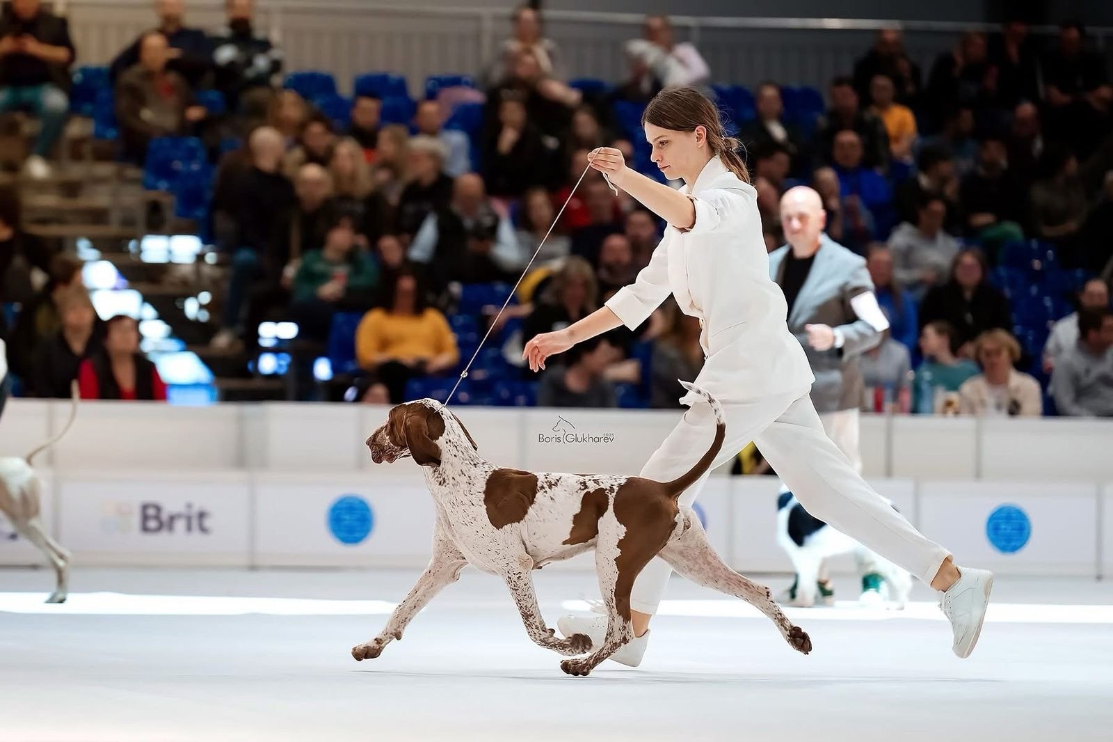 Самое первое её описание от эксперта Ekaterina Senashenko в 6 месяцев гласило: «Яркая выставочная собака», и да она такая. Это настоящая Бракко которая готова работать в полях, блистать в ринге и невероятно любить людей.